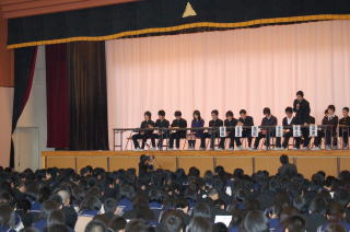 式後、作詞・作曲共に3年生による「約束」(卒業の歌) が披露された。才能豊かな秋高生である。 |