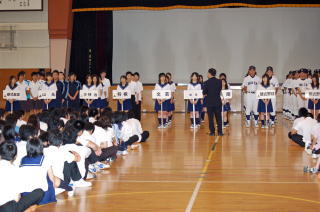 インターハイ、全国大会、全国高校野球選手権大会、軟式野球夏季大会の壮行会が、母校大体育館で行われた。