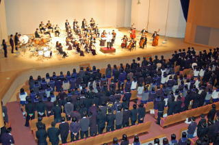 写真は、芸術鑑賞教室のフィナーレ、オーケストラをバックに校歌を大合唱。