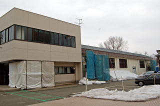写真は、大体育館の耐震補強工事のために移動する予定の剣道場。現在地から中央棟寄りに曳き家工事が行われる。現在はその準備中で、実際の曳き家は新年になってからとのこと。 |